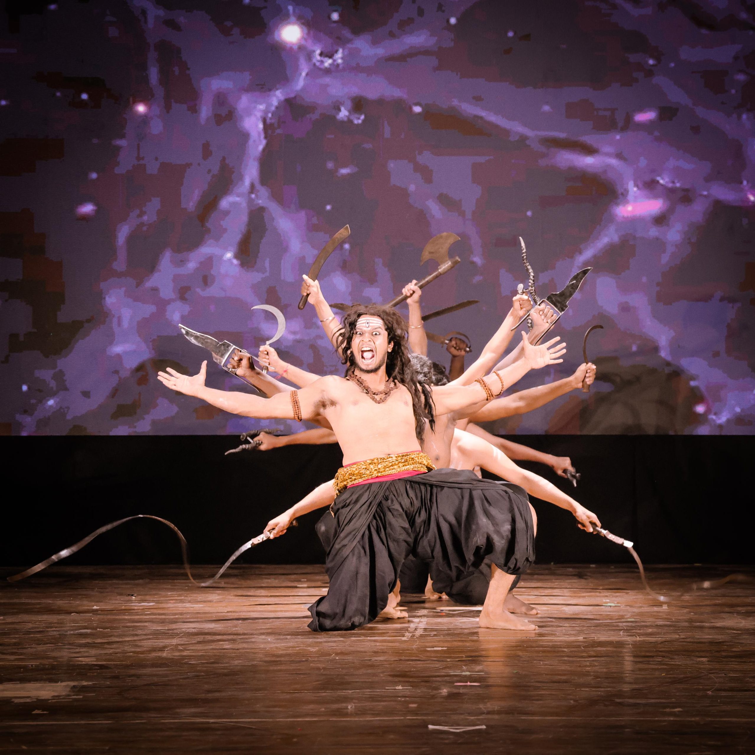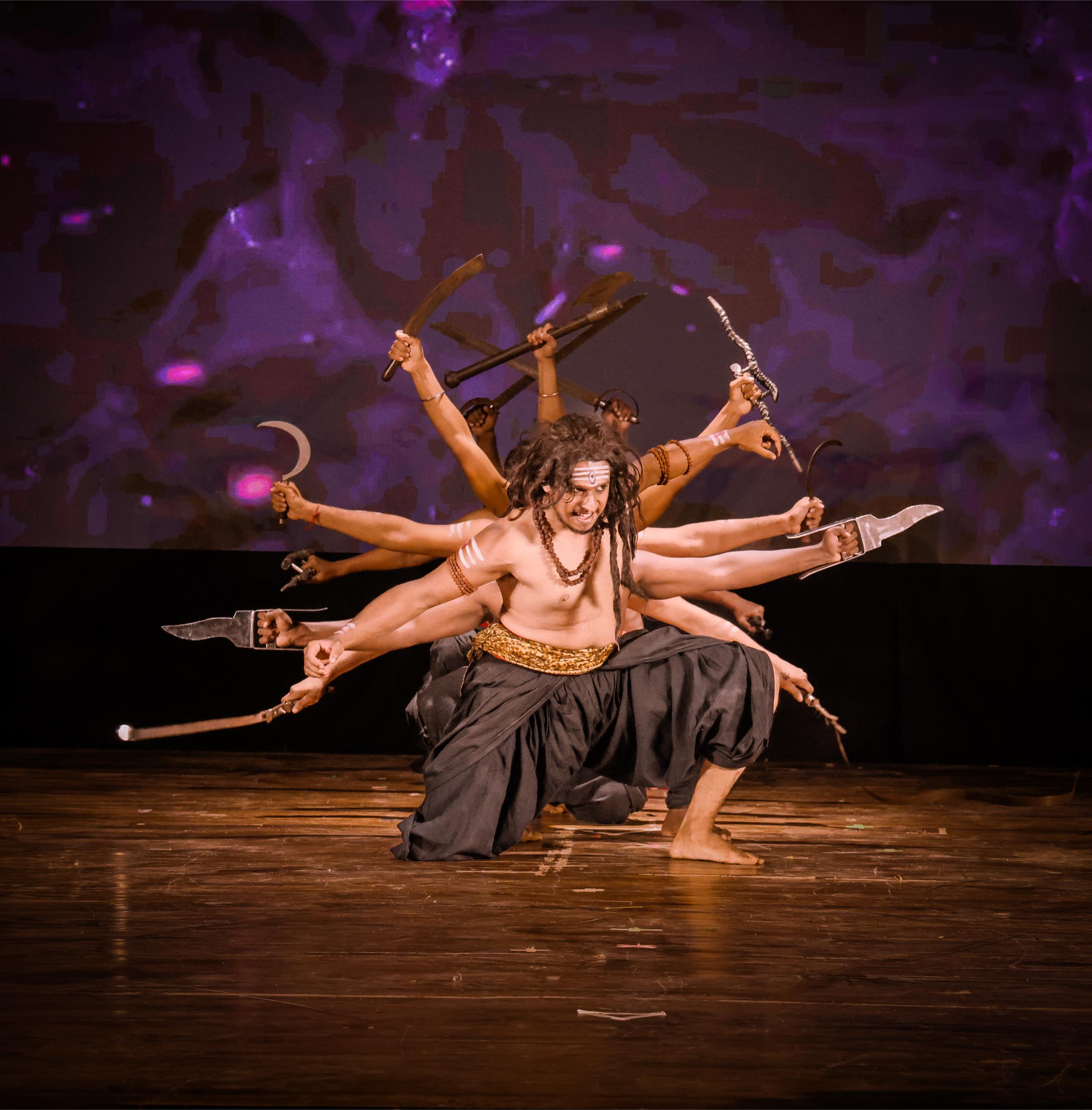 RUDRA is a dynamic fusion of Indian martial arts and expressive theatre, portraying the fierce energy of Lord Shiva through the ancient science of Kalaripayattu. Guided by Gurukkal Dr. S. Mahesh, this performance brings to life the raw power, intensity, and transcendence of Rudra.